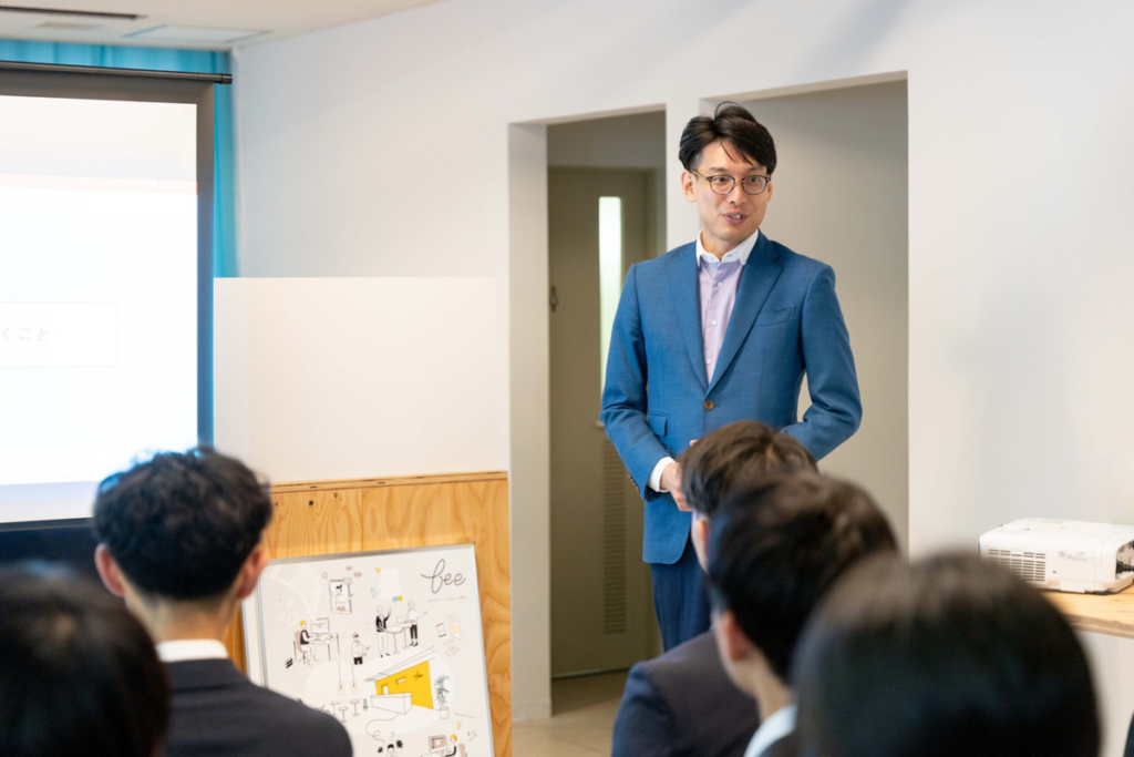 初めに、株式会社BEE代表の久保田より挨拶、簡単に弊社の事業内容や企業理念の紹介をいたしました。