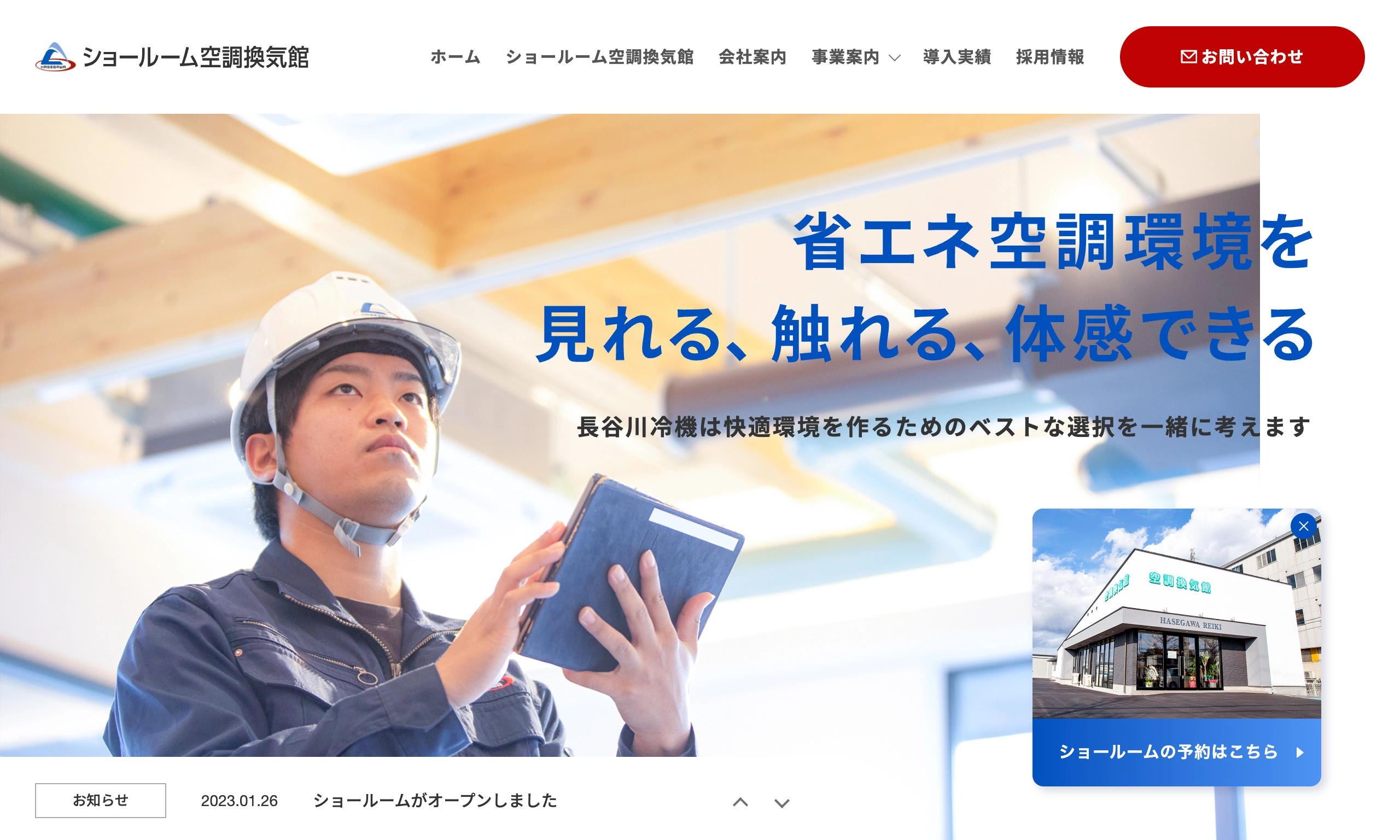 ショールームの建設に伴い「ショールーム空調換気館」をメインコンテンツとしたホームページを制作したいとご依頼をいただきました。