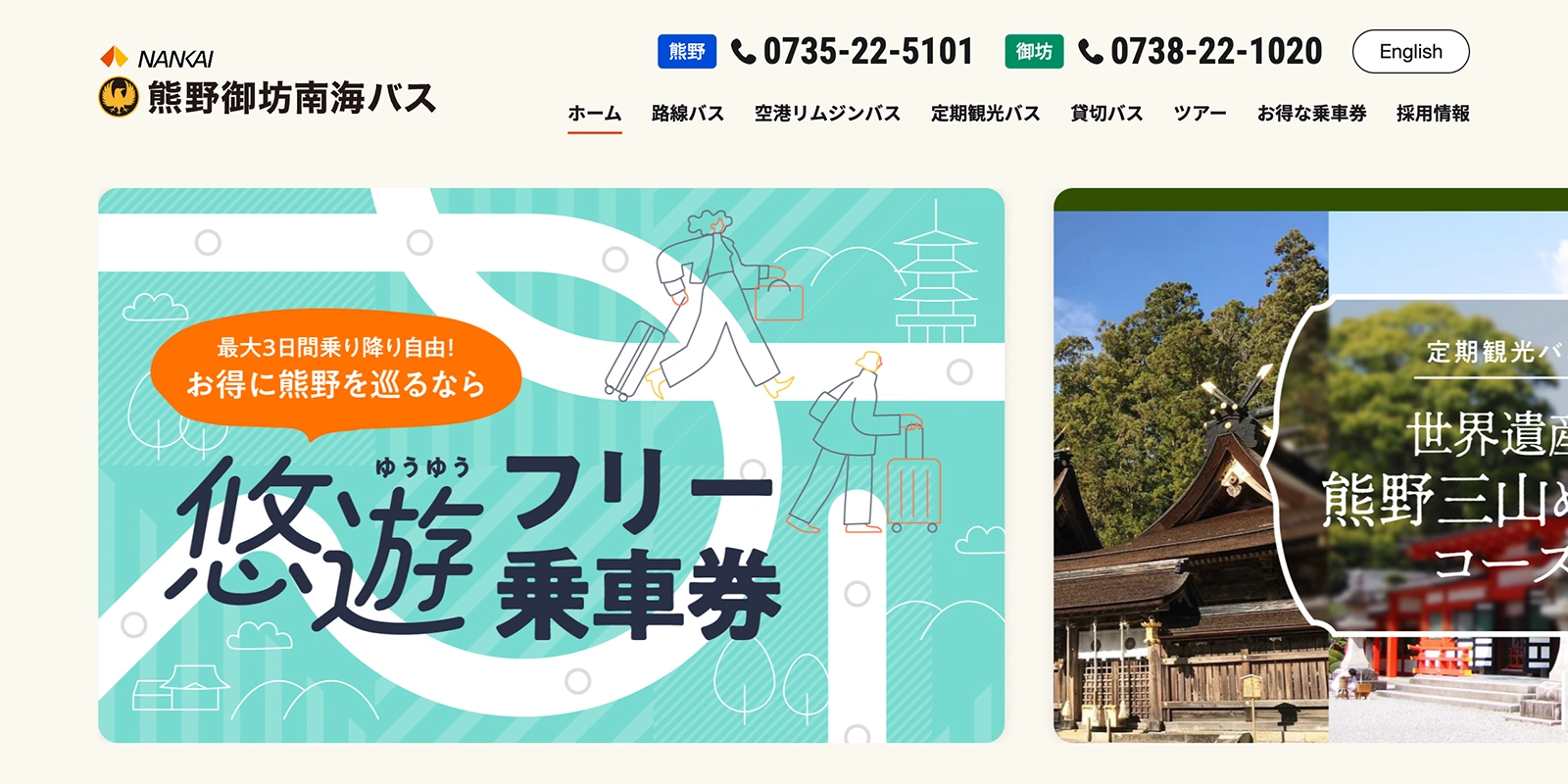 新宮市と御坊市の2拠点で営業を行う熊野御坊南海バス株式会社様のホームページを作成いたしました。